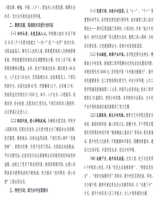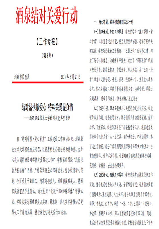 自2024年5月酒泉市启动“结对帮扶·爱心酒泉”工程以来,酒泉职业技术大学积极响应号召,以高度的社会责任感和使命感,全身心投入到特殊困难群体关爱帮扶工作中。学校紧密围绕“践行宗旨为民造福”目标,严格落实酒泉市部署要求,结合校情精心谋划、全面动员干部职工,精准对接孤儿、困难重度残疾人、特困家庭群体,构建“专业教师+学生志愿者+社会资源”三位一体帮扶模式,累计结对帮扶127户家庭,惠及群众300余人次。各学院也充分发挥职业教育资源优势,实施特色项目,助力乡村全面振兴,成为全市结对关爱行动的标杆案例。2025年5月27日,《酒泉职业技术大学结对关爱典型案例》经酒泉市民政局甄选刊于《酒泉市结对关爱行动工作专报》第8期,这是酒泉职大将职业教育的社会服务功能与民生保障有机结合,为全市结对关爱行动提供了可复制的职教方案。