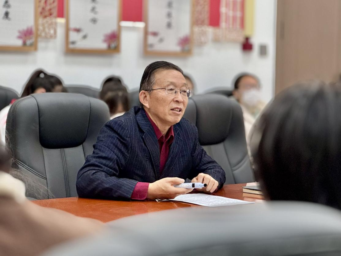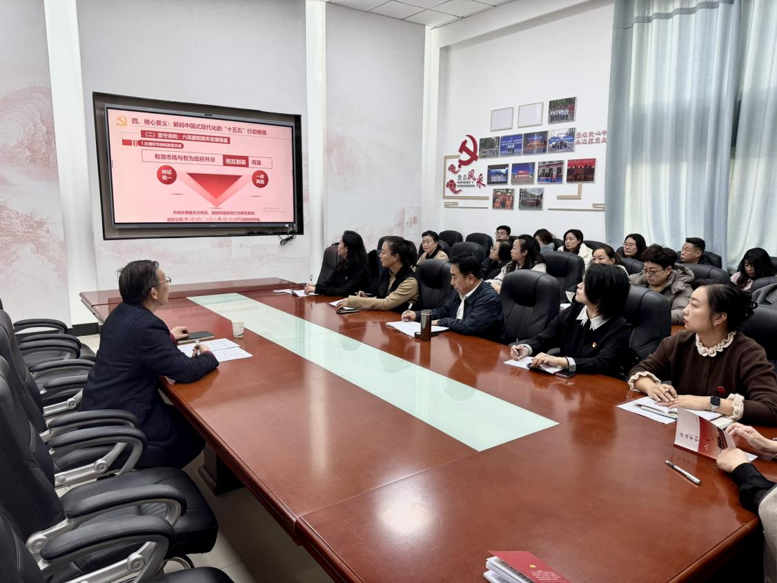 易志军以“党的二十届四中全会的核心要义,解码中国式现代化的‘十五五’行动纲领”为题,从“五个以”“两个推动”“一个确保”阐述了《中共中央关于制定国民经济和社会发展第十五个五年规划的建议》鲜明特征;从“坚持党的全面领导”“坚持人民至上”“坚持高质量发展”“坚持全面深化改革、扩大高水平开放”“坚持有效市场和有为政府相结合”“坚持统筹发展和安全”六个方面讲述了“坚守准则:六项原则筑牢发展根基”的内容;从“高质量发展取得显著成效”“科技自立自强水平大幅提高”“进一步全面深化改革取得新突破”“社会文明程度明显提升”“人民生活品质不断提高”“美丽中国建设取得新的重大进展”“国家安全屏障更加巩固”七个方面解读了“明确坐标:构建梯次推进的发展目标体系”的内容;从“建设现代化产业体系,巩固壮大实体经济根基。”“加快高水平科技自立自强,引领发展新质生产力。”“建设强大国内市场,加快构建新发展格局。”等十二个方面讲述了“精准发力:十二项重要部署绘就实践蓝图”的内容。易志军期望老师们牢牢把握“一个引领、六大原则、七方面目标、十二项重要部署、一个保障”逻辑体系,将全会精神内化于心、外化于行,以“等不起”的紧迫感、“慢不得”的危机感、“坐不住”的责任感,科学谋划学院“十五五”发展新篇,紧盯重点任务化解困难,用实实在在的发展成效检验学习贯彻成果。