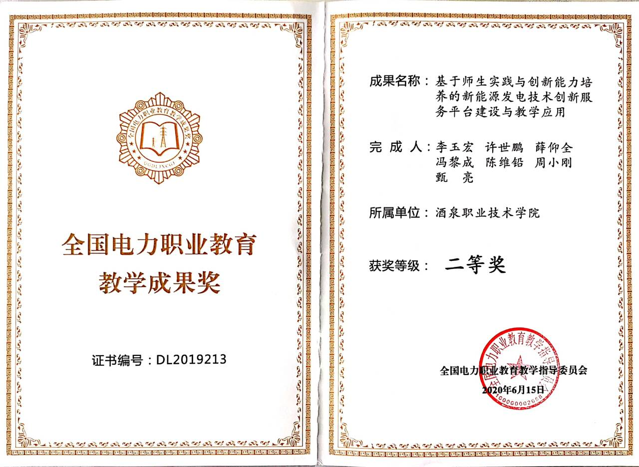 注重产学研结合,促进科教融汇,将科研工作“融”入教学过程,“汇”出师生创新意识和实践能力。以科研赋能创新型人才培养,科研与教学协同育人,将科研平台建设与教学平台建设有效结合,鼓励学生以科研项目为基础,积极参加各类创新创业项目和技能竞赛,有效提升了师生创新意识和实践能力。经过近几年实践,获得全国电力行指委教学成果奖二等奖1项,甘肃省大学生学科专业竞赛一等奖2项,甘肃省创新创业大赛二等奖2项、三等奖1项。参与建设的新能源发电技术教师团队入选教育部第三批“全国高校黄大年式教师团队”,助力学校中国特色高水平高职学校和专业建设计划项目顺利通过国家教育部验收。
