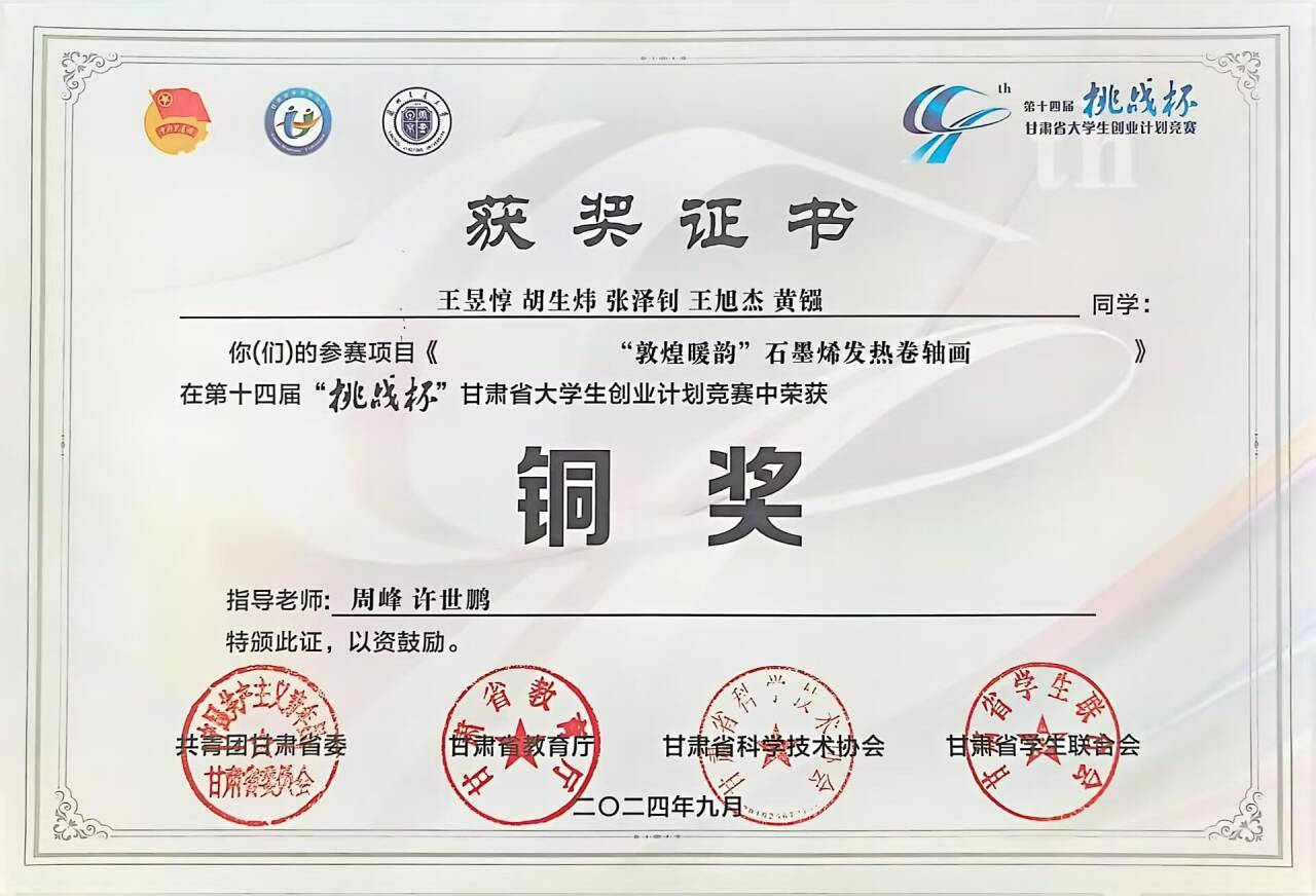 积极与企业合作,解决企业技术难题。全年赴企业开展技术调研4次,与甘肃旭碳新材料有限公司、甘肃万福动能计量检测有限公司合作开展横向技术服务项目2项,拓展了企业石墨烯电热膜产品的应用场景,解决了计量工具技术修复的难题。